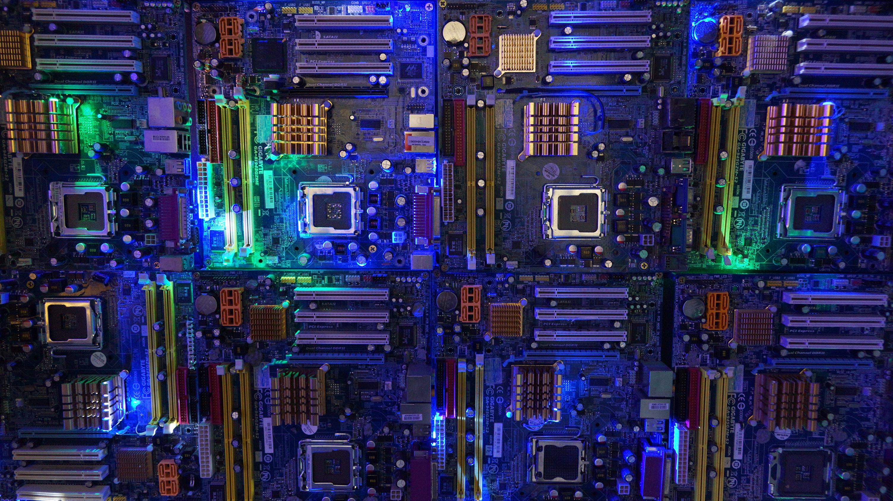 A obra de arte Eletrópolis, do artista Luiz Acosta, faz uma composição de luz e sombra, transformando placas-mãe em uma cidade eletrônica.