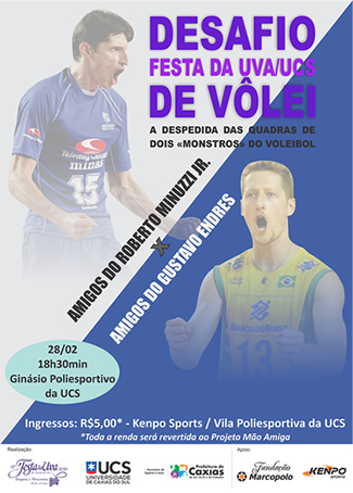 O evento, intitulado Desafio de Vôlei Festa da Uva/UCS Amigos do Roberto Minuzzi Jr x Amigos do Gustavo Endres, se inicia às 18h30min, e terá a renda revertida para o Projeto Mão Amiga, coordenado pelo frei capuchinho Jaime Bettega. Antes, a partir das 15h, os atletas participam de sessão de fotos e autógrafos no estande da UCS nos Pavilhões da Festa da Uva. A promoção é conjunta da Prefeitura, Festa e Universidade, com apoio da Fundação Marcopolo e da Kenpo Sports. A arbitragem será do gaúcho Carlos Alberto Cimino, que também se despediu da função no último ano.