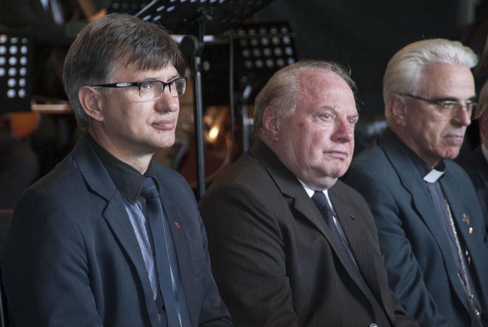 | O reitor Evaldo Kuiava, o professor Ambrósio Luiz Bonalume, presidente do Conselho Diretor da FUCS assistem à cerimônia de abertura na companhia do bispo da Diocese de Caxias do Sul, Dom Alessandro Carmelo Ruffinoni. |