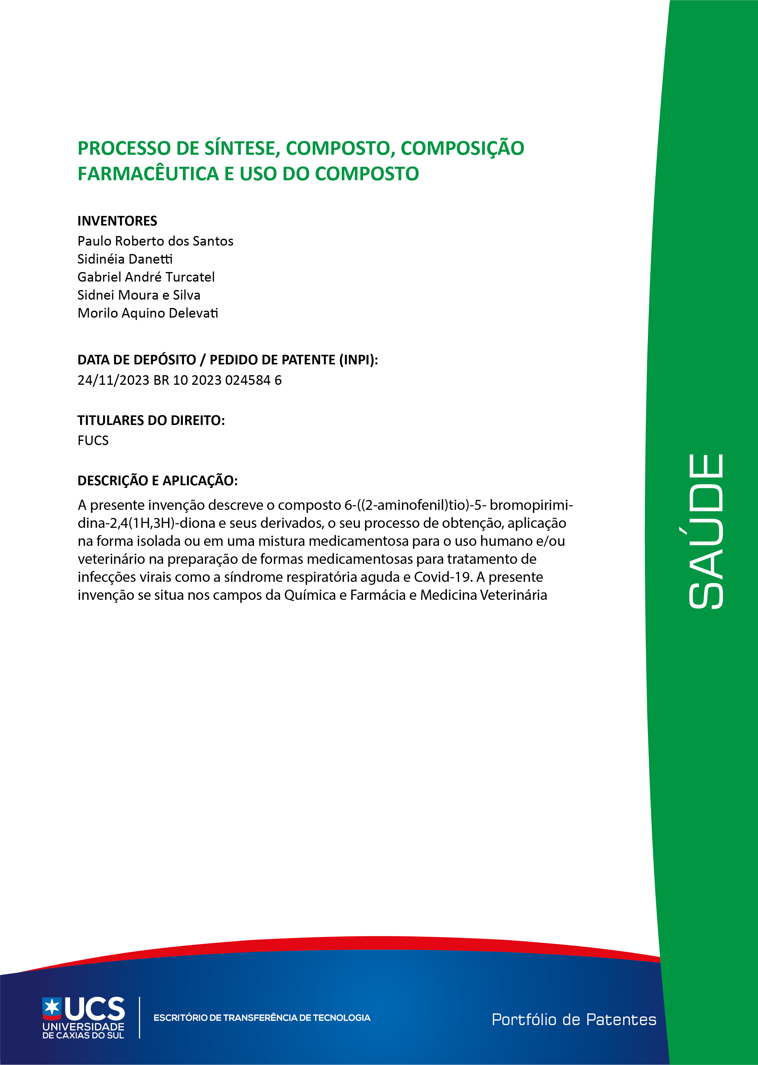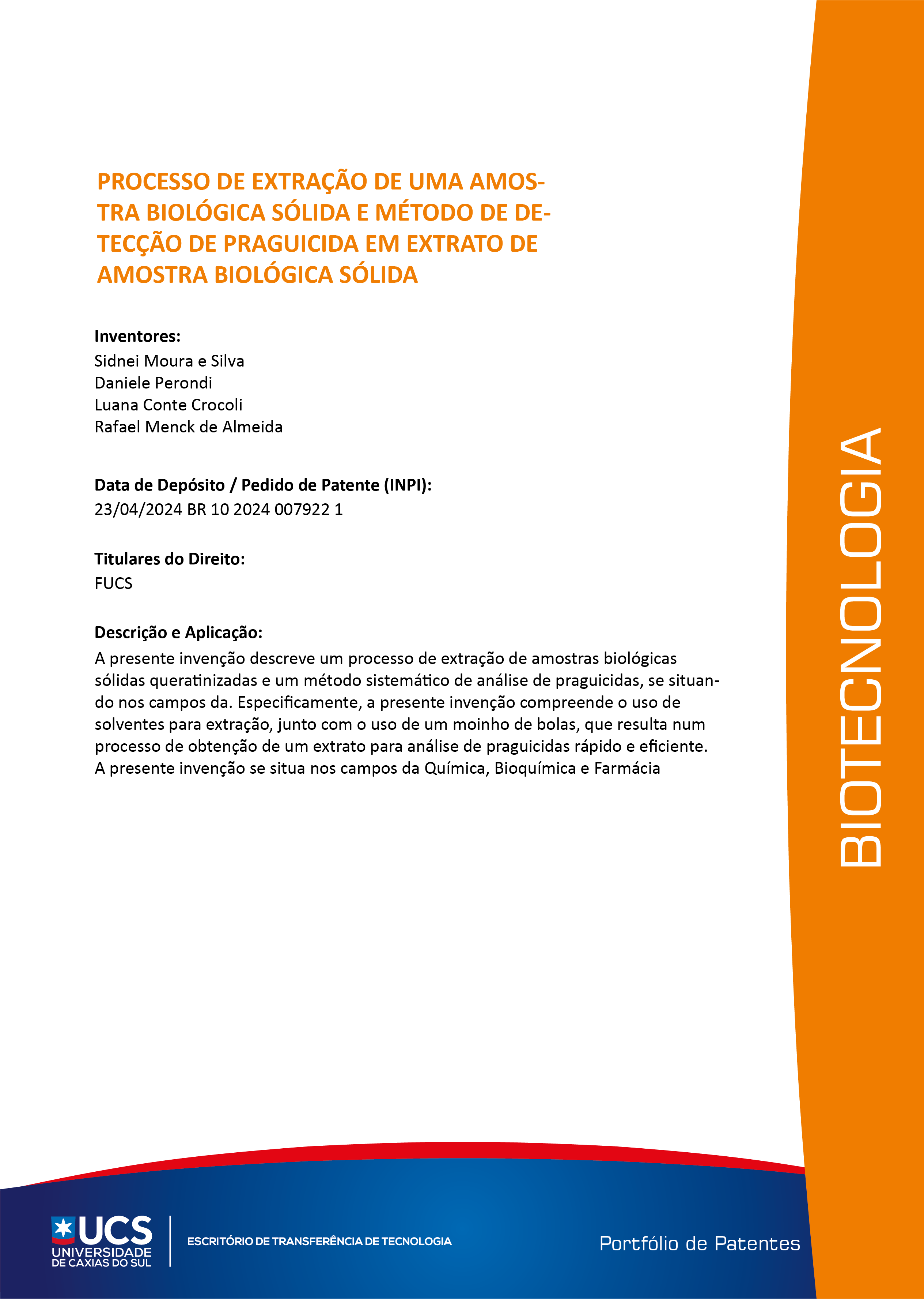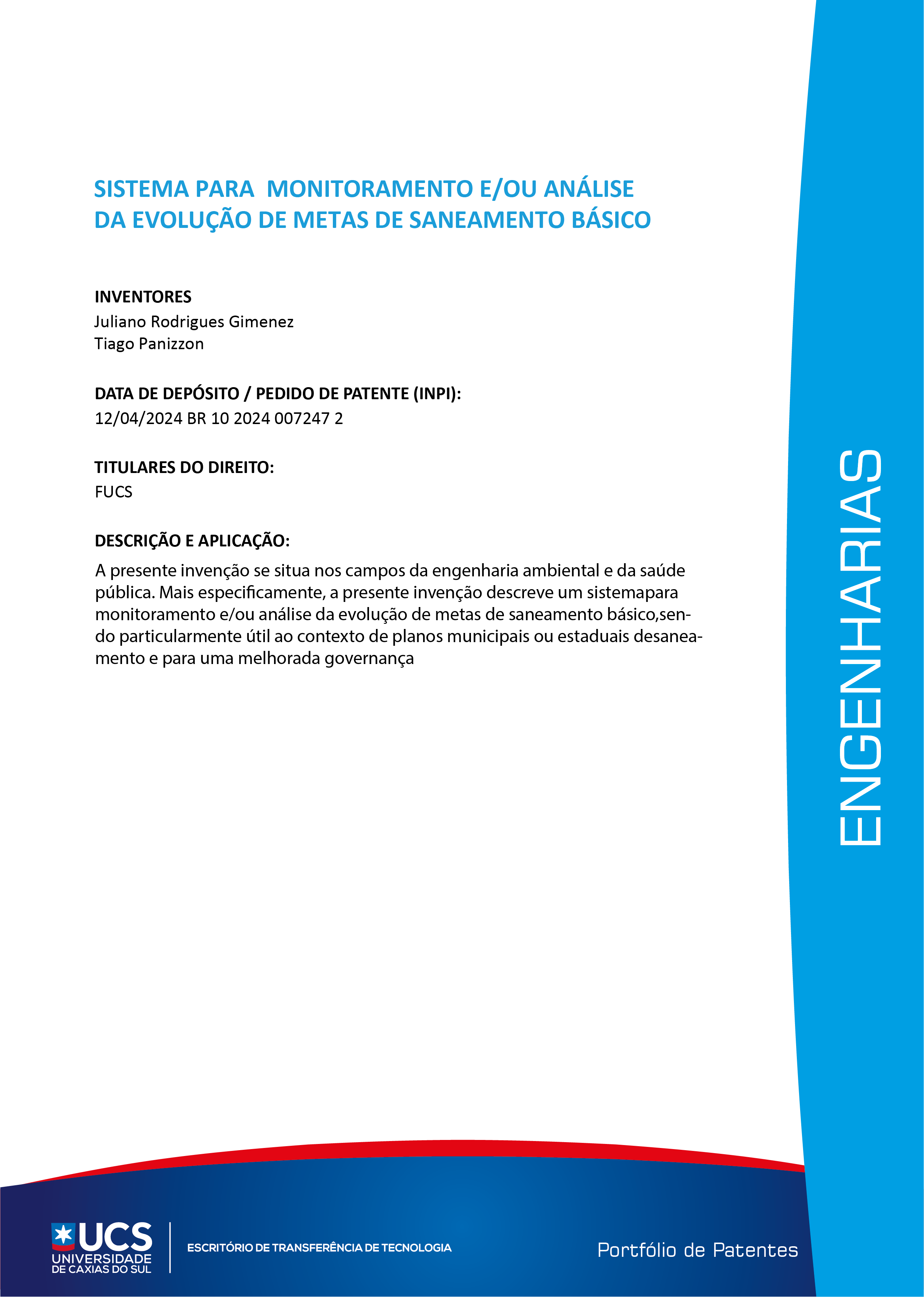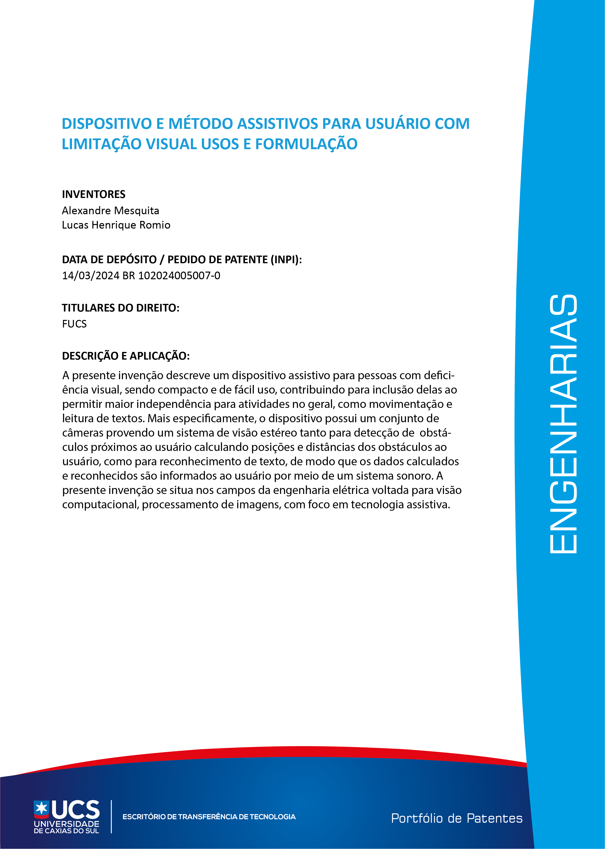 Propriedade Industrial - INPI. Elas fazem parte do Portfólio de Inovação da Universidade de Caxias do Sul e são gerenciadas pelo Escritório de Transferência de Tecnologia -