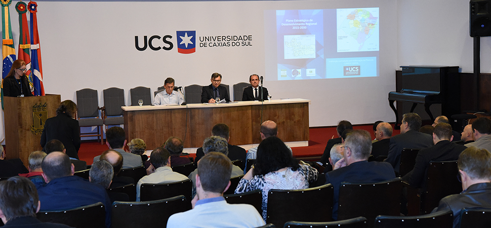 Realizado no Salão de Atos da Reitoria, no Bloco A do Campus-Sede da UCS, o encontro contou com a presença de prefeitos, vereadores e líderes de entidades empresariais e de classe de municípios abrangidos pelo Corede Serra. Na ocasião, os projetos de cada área foram apresentados pelos professores da UCS que participaram da estruturação do plano.