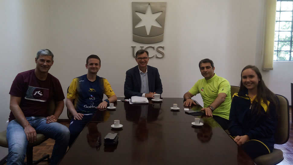 Acompanhavam o técnico Bijan Moghanlou à visita ao reitor Kuiava os professores Carlos Bonone, coordenador da Vila Poliesportiva da UCS, Daniel Brisotto, coordenador da ACTKD - Associação Caxiense de Taekwondo (parceira da UCS) e docente do curso de Educação Física, e a atleta da ACTKD Júlia Molon.