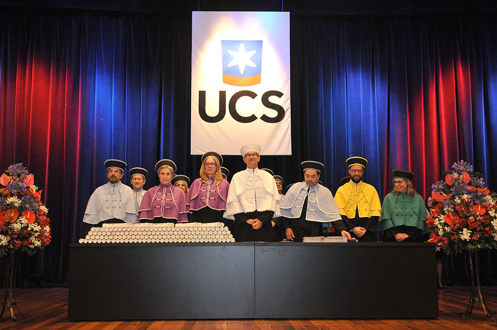Realizada no UCS Teatro e estendida à participação dos familiares dos concluintes, a cerimônia foi conduzida pelo reitor Evaldo Kuiava e pelo pró-reitor de Pesquisa e Pós-Graduação, Juliano Rodrigues Gimenez.