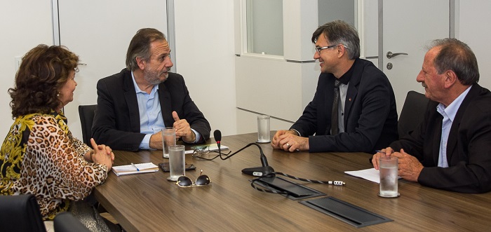 A Escola de Gastronomia da UCS foi a pauta do encontro realizado entre o reitor Evaldo Kuiava, o prefeito de Flores da Cunha, Lídio Scortegagna, o presidente da empresa Florense, Gelson Castellan, e os representantes do Centro Empresarial de Flores da Cunha - Tiago Paviani, vice-presidente, e Gilberto Boscato, diretor - na manhã desta quarta-feira (17) no Gabinete do Reitor.
