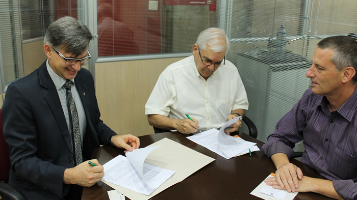 Na foto, detalhe da assinatura do convênio, pelo reitor Evaldo Kuiava e representantes da Banricoop.