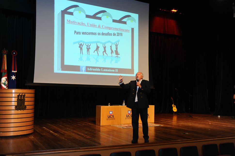 Após a participação descontraída de Bastiana, personagem do ator Davi de Souza, subiram ao palco, o reitor Evaldo Kuiava, o presidente do Conselho Diretor da FUCS, Ambrósio Luiz Bonalume, e o diretor Administrativo e Financeiro da UCS, Cesar Augusto Bernardi, para suas intervenções. No encontro da manhã, o primeiro a falar foi o professor Bonalume, que lembrou as dificuldades de 2015 para a FUCS e suas mantidas, mas trouxe também boas notícias: "Essas dificuldades já foram superadas e chegamos ao final do ano com um pequeno superávit. E isso só foi possível graças ao trabalho de vocês. Temos a certeza de que 2016 será tão profícuo quanto 2015, com o trabalho de todos vocês".