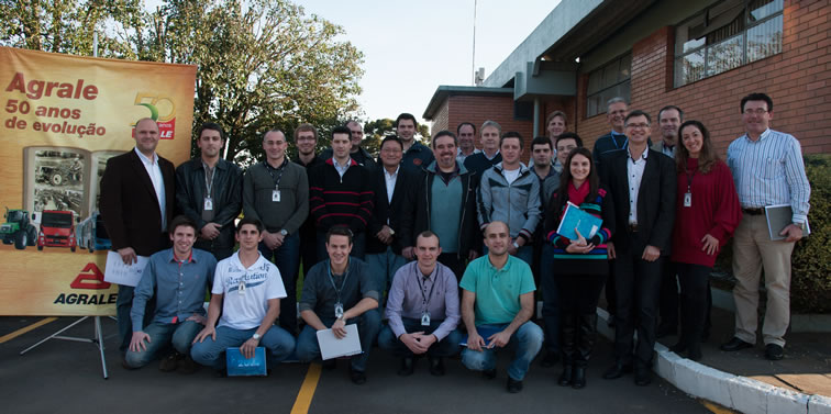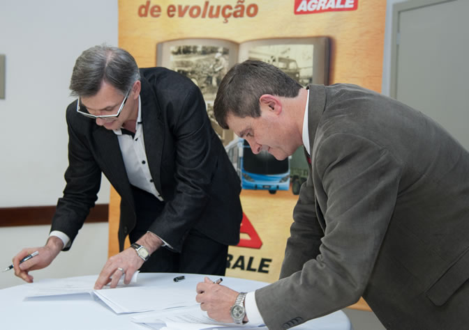 O reitor Evaldo Kuiava e o diretor do Centro de Ciências Exatas e Tecnologia, professor Carlos Alberto Costa, participaram na tarde desta quarta-feira de ato na empresa Agrale para a assinatura de Acordo de Cooperação visando à realização da segunda edição do Curso de Especialização em Engenharia Automotiva destinado aos engenheiros da Agrale.