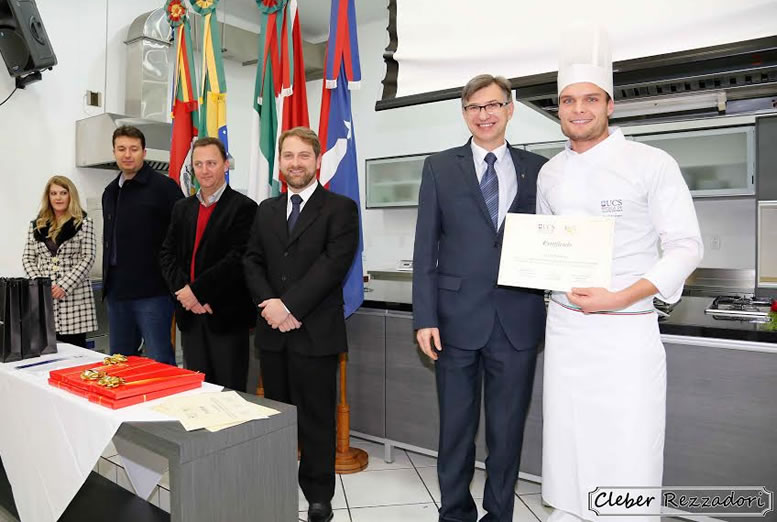 Na noite de sexta-feira, 11 de julho, o reitor Evaldo Kuiava participou da solenidade de certificação da 27ª turma do curso de Formação Básica em Chef de Cozinha na Escola de Gastronomia UCS-ICIF. Essa edição do curso reuniu 12 alunos de diferentes cidades do Rio Grande do Sul e de outros estados: Caxias do Sul, Flores da Cunha, Veranópolis, Rio Pardo, Santana da Boa Vista, Carazinho, Porto Alegre, Cascavel (PR), Belo Horizonte (MG), Rondonópolis (MT) e Ribeirão Preto (SP).