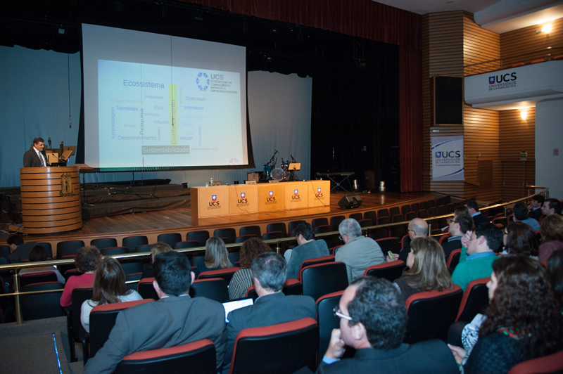 O encerramento do encontro da manhã ficou para o vice-reitor e pró-reitor de Inovação e Desenvolvimento Tecnológico, professor Odacir Deonisio Graciolli, que falou sobre o Ecossistema de Conhecimento, Inovação e Empreendedorismo que está sendo implantado na Universidade, com o objetivo de gerar produção científica, inovação e conhecimento que possa atrair as empresas a interagirem com a Instituição e, assim, fomentar a criação de mecanismos capazes de alimentar e subsidiar a pesquisa, que, na visão do pró-reitor, não pode ser dissociado do ensino, de graduação e de pós-graduação. "Estamos mantendo contato com muitas empresas e podemos afirmar que elas acreditam e estão apostando na parceria com a Universidade para buscar a inovação em suas áreas de atuação. E o que vai atrair as empresa para este Ecossistema de Conhecimento, Inovação e Empreendedorismo são os nossos recursos humanos, isto é, nossos professores e nossos estudantes - de graduação e pós-graduação - que atuam em projetos de pesquisa e desenvolvimento tecnológico". O pró-reitor também apresentou a estruturação do Parque Tecnológico da UCS (TecnoUCS)e a estruturação de uma rede de incubadoras integrando as unidades de Caxias do Sul, São Sebastião do Caí e Bento Gonçalves.