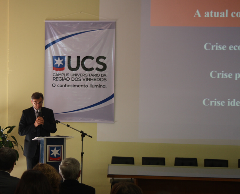 "A Universidade de Caxias do Sul, enquanto Instituição Comunitária, tem o compromisso de estar atenta às demandas de sua comunidade local em vista de atendê-las com a excelência acadêmica. Portanto, na UCS, a Educação não é um negócio, é um COMPROMISSO". Logo no início de sua fala aos professores no UCS Teatro, o reitor Evaldo Kuiava reafirmou o compromisso no qual a Universidade se fundamenta para, em seguida, fazer uma análise da atual conjuntura - com sinais de crise econômica, política e identitária - e dos seus efeitos sobre a Universidade no que se refere ao número de alunos e aos níveis de inadimplência. "Crises nos levam à reflexão e à ação; e a solução dos problemas pode estar na sua resolução ou na sua dissolução. Por isso precisamos discutir o modelo de universidade (nossa identidade), a atuação do professor (modelo epistemológico; público x privado) e a a proposta pedagógica da nossa Instituição. Nós, professores temos que nos conectar com o mundo e o tempo atual, com o que nos é exigido; temos que pensar na sustentabilidade financeira da Instituição; precisamos avaliar o perfil do nosso docente e a taxa de aprendizagem que conseguimos alcançar".