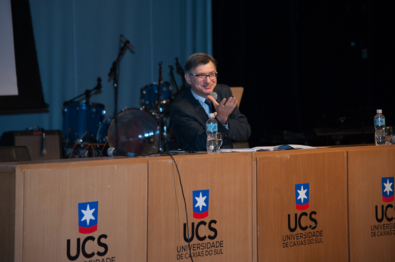 Alunos de graduação e pós-graduação, professores, pesquisadores do Brasil e do exterior, representantes da comunidade e de entidades ligadas ao Turismo participaram na noite desta quinta-feira (2) da palestra de abertura do 8º Seminário de Pesquisa en Turismo do Mercosul e do 1º Hospitalidade em Colóquio: Pesquisa e Ensino. O reitor Evaldo Kuiava; o pró-reitor de Pesquisa e Pós-Graduação, José Carlos Köche, que integra o corpo docente do programa de Pós-Graduação em Turismo e Hospitalidade (PPGTUR/UCS); a professora Marcia Maria Capellano dos Santos, coordenadora científica do evento e coordenadora do PPGTUR/UCS; o professor Pedro de Alcântara Bittencourt César, coordenador geral do evento; o pesquisador Francisco Antonio dos Anjos, diretor-presidente da Associação Nacional de Pesquisa e Pós-Graduação em Turismo (ANPTUR); e a secretária Municipal de Turismo, Drica de Lucena, estavam na mesa de abertura para dar as boas-vindas aos participantes e recepcionar o convidado especial da noite, o teólogo e filósofo Leonardo Boff que veio conversar sobre "ética, hospitalidade e turismo".