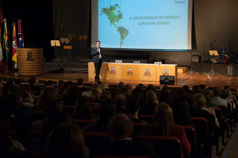 O reitor também elencou as principais ações e projetos para este semestre, tais como: a revisão do Projeto Pedagógico Institucional e dos Projetos Pedagógicos dos cursos (modelos sustentáveis); a criação de novos cursos (Odontologia em Caxias do Sul e Psicologia no CARVI) e novos laboratórios (de Engenharia no CARVI); os investimentos em infraestrutura e equipamentos (na Vila Poliesportiva, no Instituto de Medicina do Esporte e no curso de Medicina); a Construção do Centro de Estudos e Diagnóstico Animal, incluindo a edificação do Hospital Veterinário da UCS; o desenvolvimento de APPs que auxiliem na gestão acadêmica e na relação professor-aluno; e a implantação do TecnoUCS, entre outras. Ao finalizar, o reitor instigou os professores a entender e atender às demandas da sala de aula: "é preciso progredir para um bom desenvolvimento da relação entre professor-aluno, de uma sala de aula dinâmica para, assim, alcançar o horizonte da excelência".