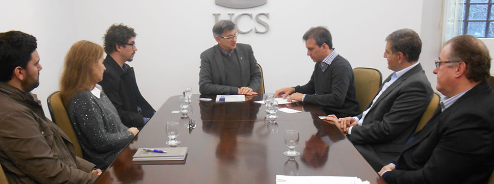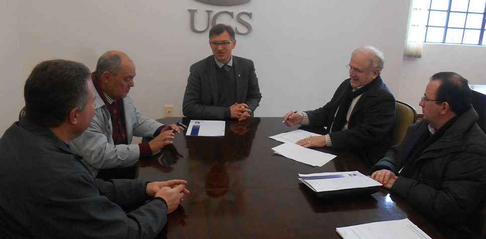 O reitor Evaldo Kuiava, o pró-reitor Acadêmico Marcelo Rossato, e o chefe de Gabinete Gelson Leonardo Rech, receberam na tarde de ontem (2) uma comissão de vereadores que integra a Comissão Temporária Especial de Proteção e Defesa dos Animais em Caxias do Sul. Eles vieram conversar sobre futuras parcerias entre o Hospital Veterinário da UCS e as entidades protetoras dos animais que atuam em Caxias do Sul. O reitor explicou que o Hospital Veterinário, que começará a ser construído ainda em 2015, tem entre suas finalidades a prestação de serviços à comunidade. "Quando o Hospital estiver em funcionamento, convidaremos a Prefeitura Municipal para tratar de parcerias com entidades da comunidade caxiense". Participavam da comitiva, os vereadores Flávio Dias (presidente da Comissão) e Neri Carteiro e assessores; e o jornalista Clever Moreira, representando o vereador Adelino Teles.