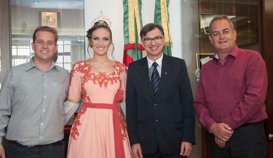O reitor Evaldo Kuiava recebeu, na manhã de hoje, a visita do prefeito de São Sebastião do Caí, sr. Darci José Lauermann, que também é presidente da 20ª Festa da Bergamota que se realizará, de 20 de maio a 5 de junho de 2016. Ele estava acompanhado pela rainha, Aline Schneider, e aproveitou a reunião para convidar a Reitoria para participar da Festa, que irá mostrar as riquezas do município, com uma exposição de citrus e flores, de móveis antigos e de produtos da agroindústria local.
