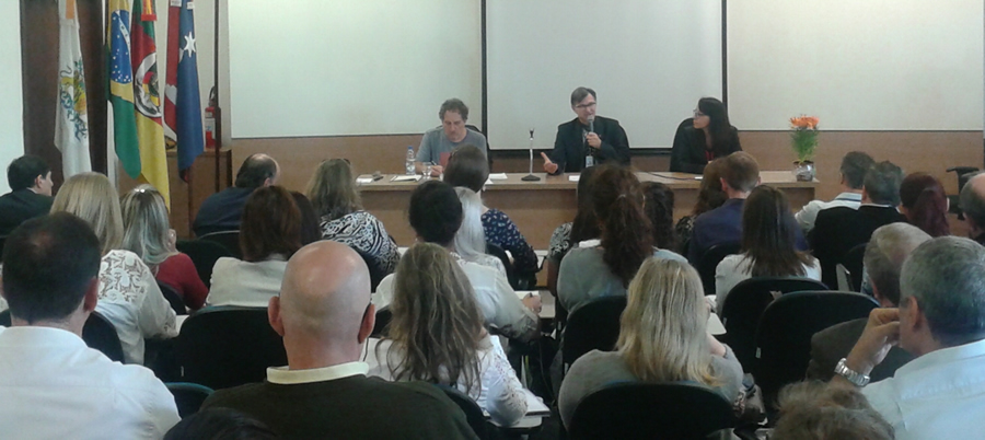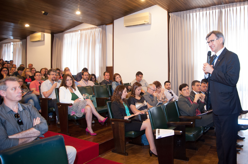 Docente colaborador do Programa de Pós-Graduação em Educação, o reitor Evaldo Kuiava participou da aula inaugural e deu as boas-vindas ao conferencista.