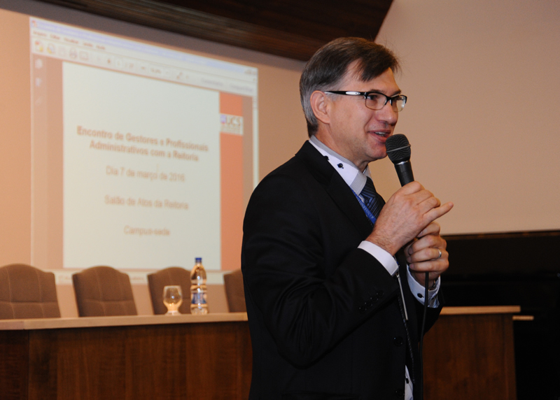 Em sua fala, o reitor explicou o que significa atuar em uma universidade comunitária como a UCS, destacando que todos os recursos financeiros arrecadados são investidos na qualificação das suas ações e aconselhou os colaboradores a sempre buscar o aprimoramento de suas competências e valorizar o trabalho em equipe.