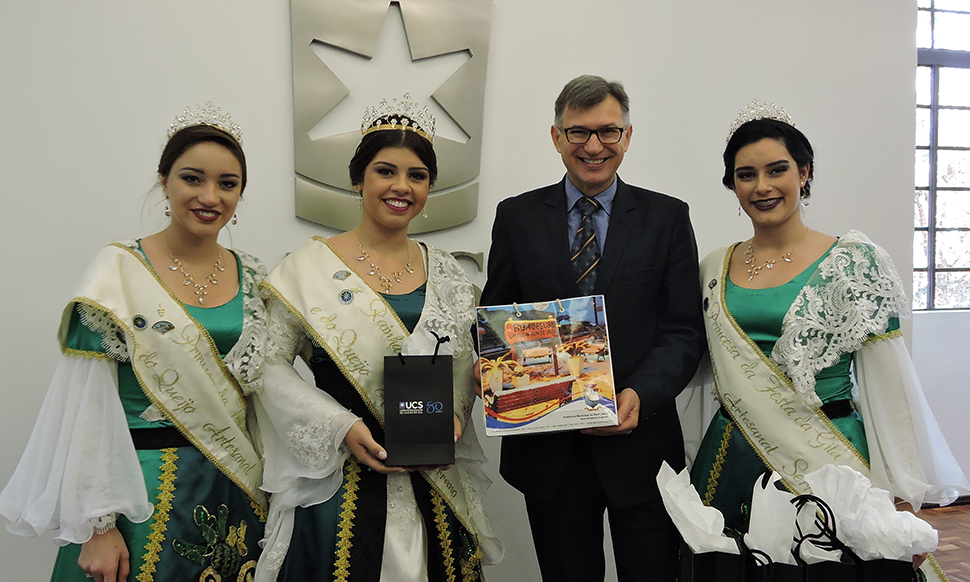 O reitor Evaldo Kuiava recebeu no dia de ontem (27) uma comitiva de representantes da cidade de Bom Jesus que veio divulgar a 12ª Festa da Gila e a 5ª Festa do Queijo Artesanal Serrano. Integravam a comitiva, as soberanas Nathália Borges Silveira (rainha), Nicoly De Liz Walter e Paula Soares Antônio (princesas), o assessor de comunicação, Duclerc Silva, e a coordenadora de Turismo do município, Cláudia Silva Borges.