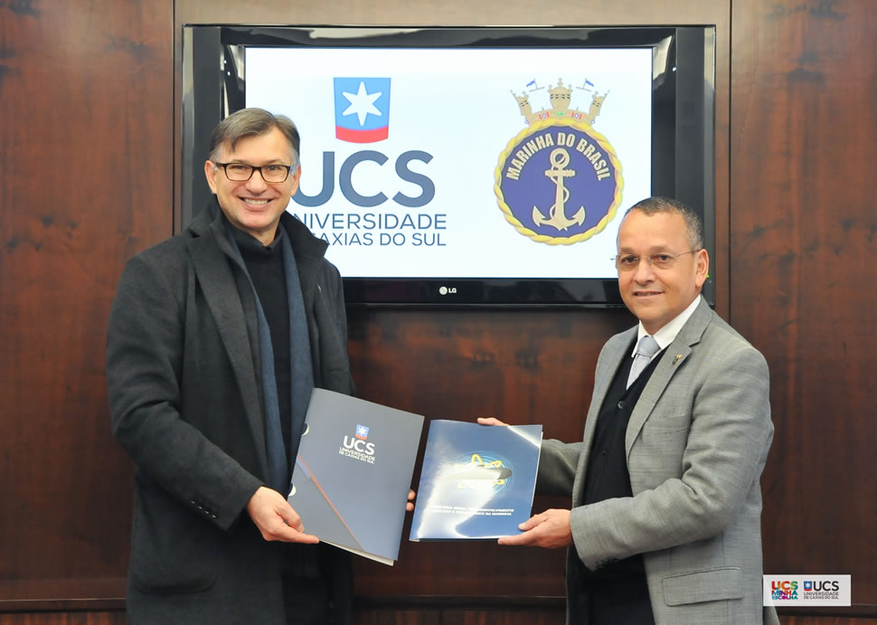 A visita realizada em novembro do ano passado por uma comitiva da Marinha do Brasil à Universidade deu origem à formalização, na manhã desta terça-feira, dia 6 de junho, de um protocolo de intenções mútuas, assinado pelo reitor Evaldo Kuiava e pelo contra-almirante Paulo Roberto da Silva Xavier, para prestar apoio mútuo às atividades de pesquisa e prospecção científico-tecnológica das duas instituições.