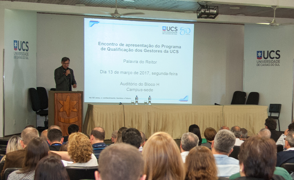 Os gestores administrativos e acadêmicos participaram, na última segunda-feira, dia 13, no auditório do Bloco H, do primeiro encontro Programa de Qualificação dos Gestores, que tem como objetivo qualificar a gestão por meio da formação e desenvolvimento contínuo, buscando a melhoria da qualidade dos serviços prestados pela Instituição. A atividade, coordenada pela Gerência de Recursos Humanos, foi aberta pelo reitor Evaldo Kuiava, que apresentou as grandes linhas que nortearão o Programa.