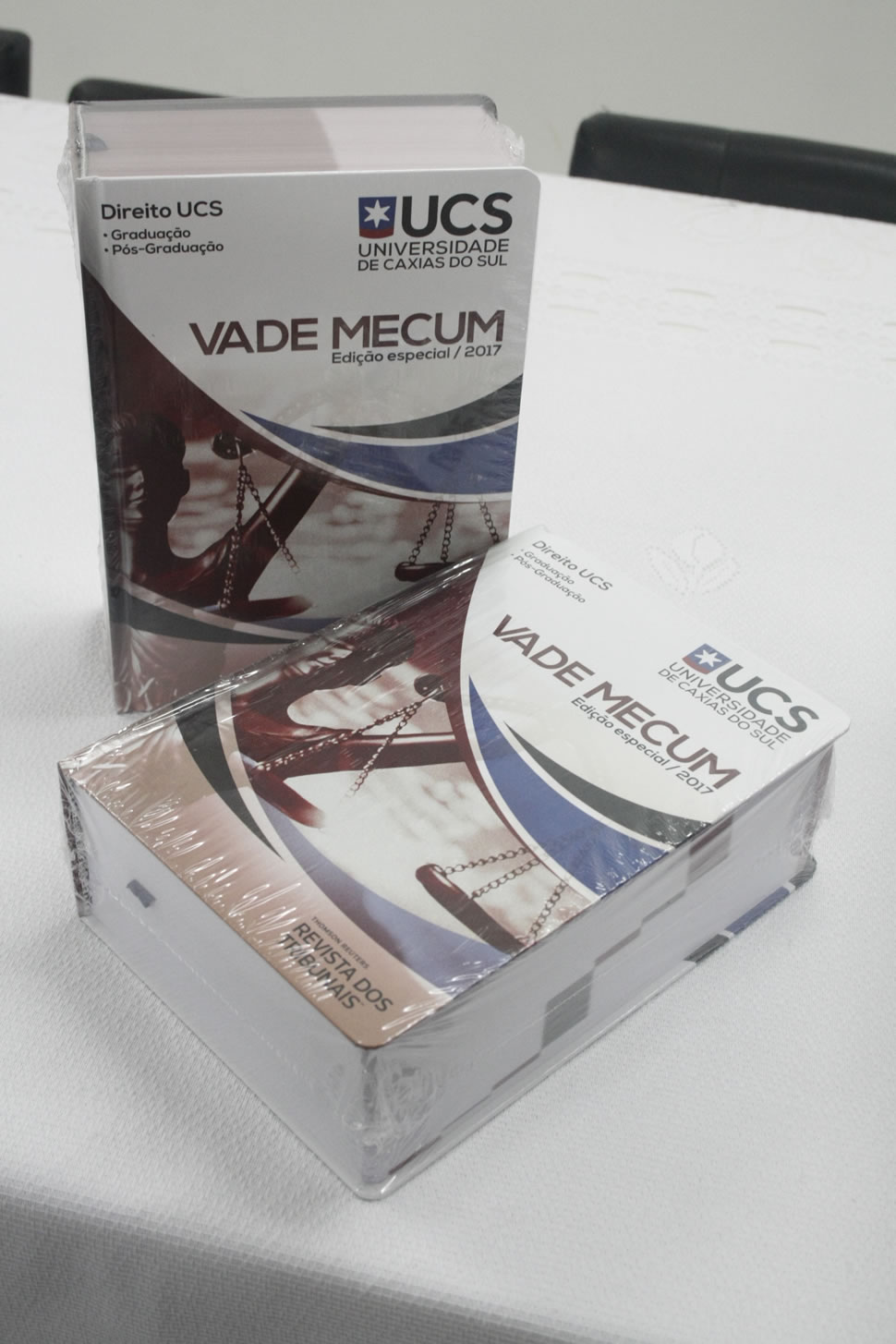 Durante o encontro foi entregue aos acadêmicos do Direito - ingressantes e formandos - Vade Mecum, principal compêndio sobre a legislação geral brasileira, incluindo a Constituição Federal, códigos, legislações complementares, estatutos e súmulas de tribunais superiores, entre outras leis. A edição personalizada é resultante da parceria entre a UCS e a editora Revista dos Tribunais, a mais importante da área jurídica do país. A publicação recebeu uma edição customizada, com inclusão de logotipia da UCS e de apresentação do reitor Evaldo Kuiava.