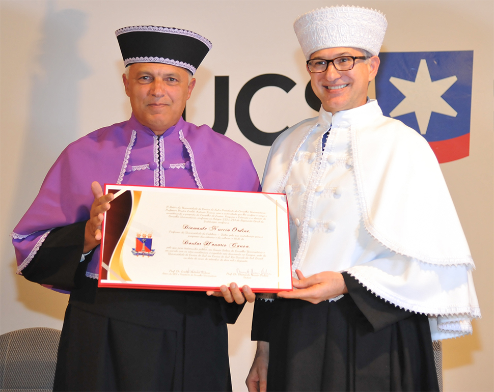 O reitor Evaldo Kuiava, presidente do Conselho Universitário (CONSUNI) presidiu, na manhã desta terça-feira, dia 26 de setembro, a sessão solene e pública do Consuni que outorgou ao sociólogo italiano Domenico De Masi, o título de Doutor Honoris Causa pela sua contribuição ao mundo da Ciência, das Letras e das Artes. [ Veja como foi. ]