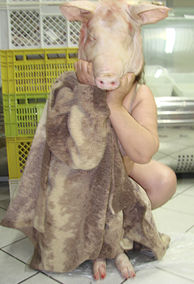 Evenir Maria Comerlatto - Acadêmica de Licenciatura em Artes Visuais, série de três fotografias, Eu porco II - Sátira à Beleza orca Dor, 2007.