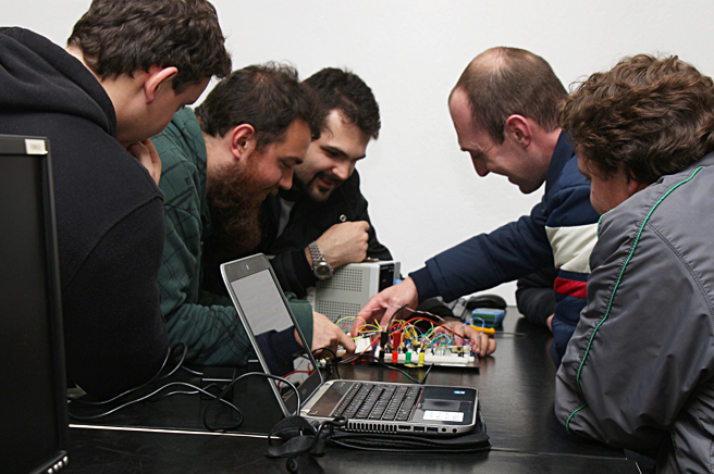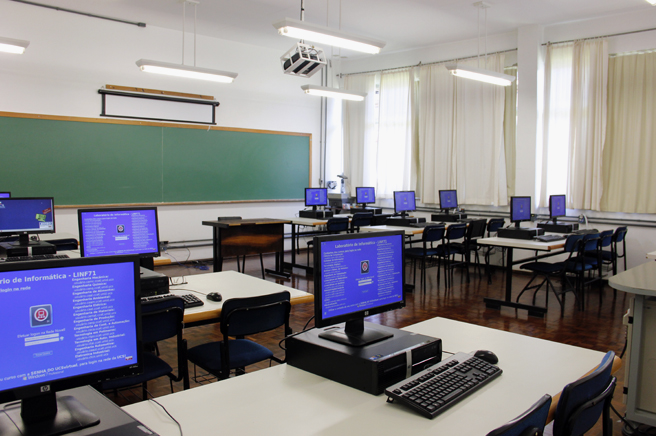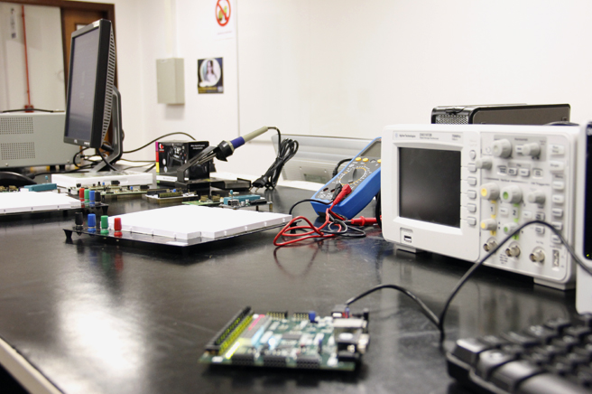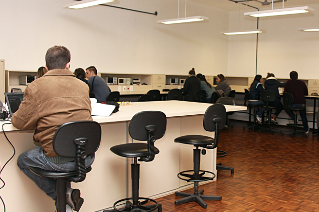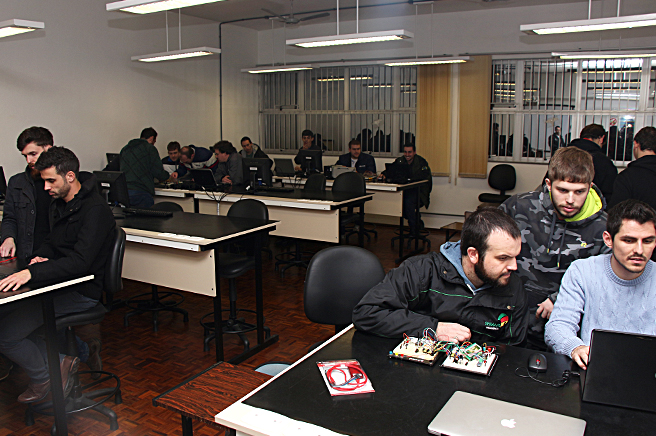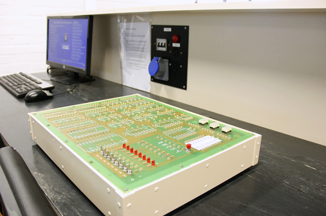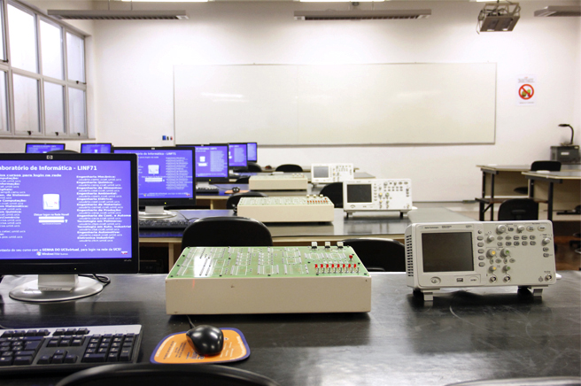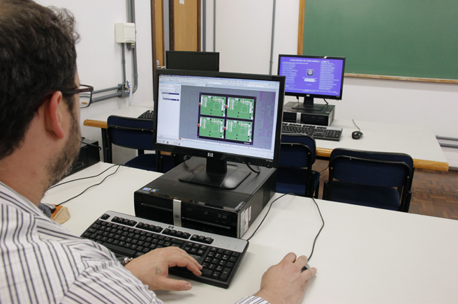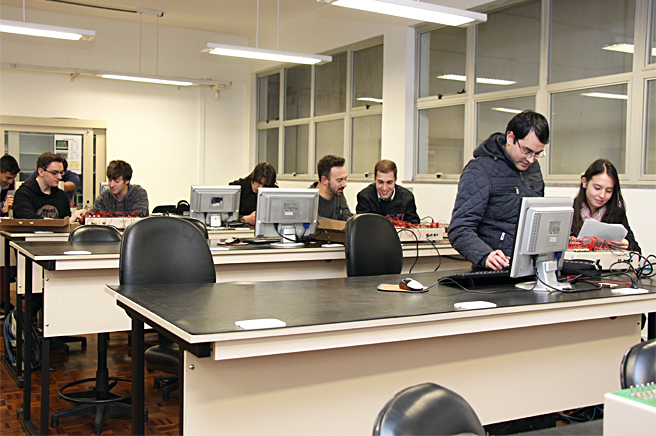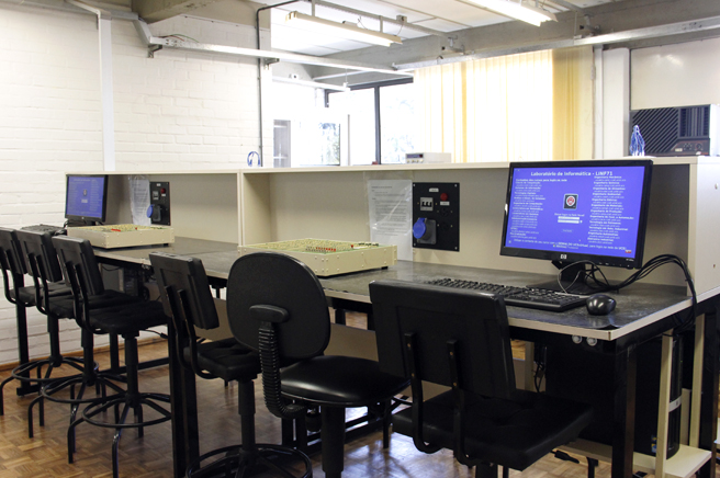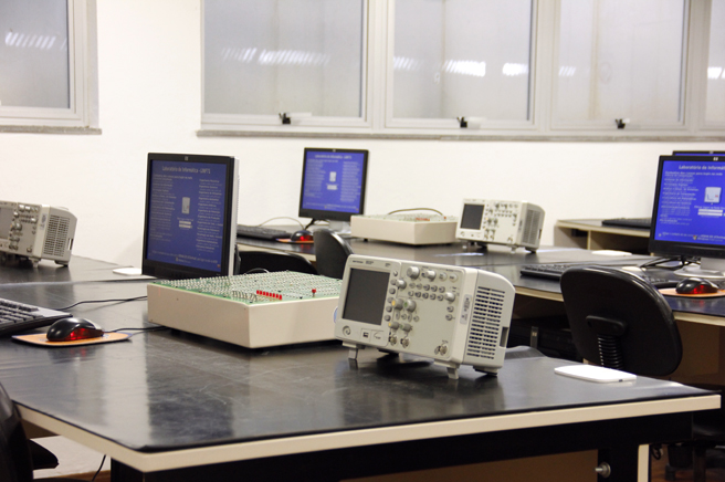 Laboratório destinado à simulação de circuitos eletrônicos, desenvolvimento de layout de placas de circuito impresso, simulação de sistemas de controle e simulação de sistemas envolvendo robôs industriais.