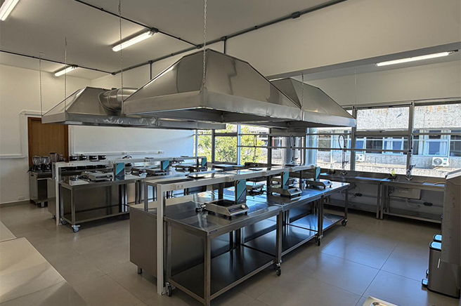 Possui equipamentos e utensílios de alta qualidade, simulando um ambientes de cozinha industrial e de restaurantes.