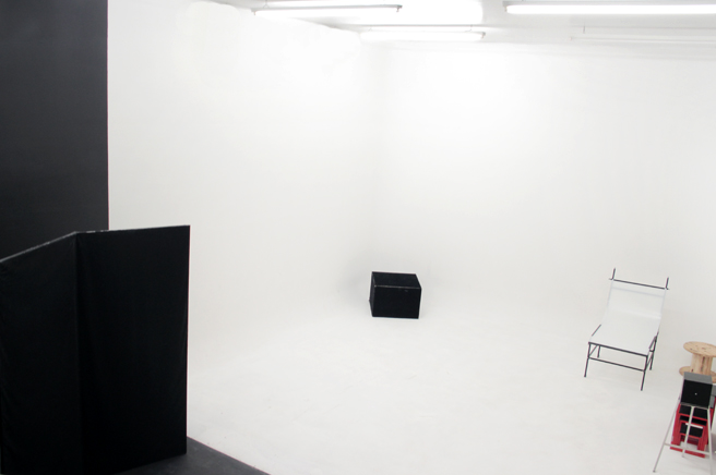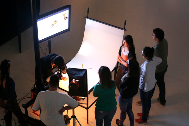 Em área de 140m², pé direito de seis metros, fundo infinito em branco e em preto, equipado com luz continua, com flashs/acessórios e câmeras DSLR profissionais
