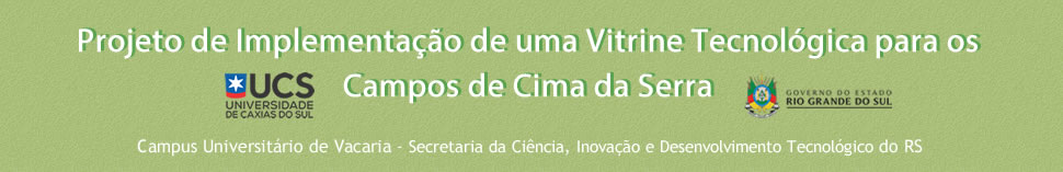 Projeto realizado pela Universidade de Caxias do Sul - Campus Universitário de Vacaria, no âmbito do Programa de Apoio aos Polos Tecnológicos do RS, mediante convênio firmado entre a UCS e a Secretaria da Ciência, Inovação e Desenvolvimento Tecnológico do RS, com abrangência nos municípios do Polo de Inovação Tecnológica Campos de Cima da Serra e do Corede Campos de Cima da Serra.