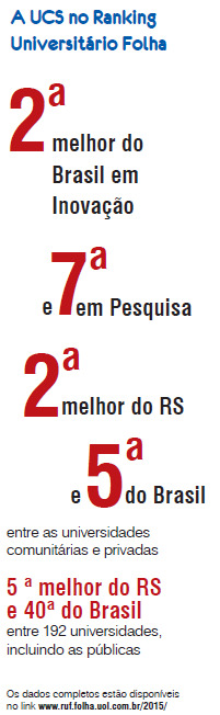 As posições, obtidas no Ranking Universitário Folha (RUF) 2015, o mais conceituado levantamento sobre o ensino superior do país, divulgado em 14 de setembro, confirmam a Universidade de Caxias do Sul (UCS) como uma das mais qualificadas universidades brasileiras. A análise, elaborada pelo jornal Folha de S. Paulo, pesquisa anualmente instituições públicas, privadas e comunitárias a partir de cinco critérios: Ensino, Pesquisa, Mercado, Inovação e Internacionalização. À exceção da manutenção do 2º lugar nacional em Inovação, a UCS subiu em todas as demais classificações do ranking. ?Esses resultados coroam as ações da reitoria, professores, alunos e funcionários em prol das diretrizes institucionais de excelência, inovação, desenvolvimento, inserção social e sustentabilidade, além de reforçar nossa responsabilidade em alcançar ainda mais qualificação?, avalia o reitor Evaldo Antonio Kuiava.