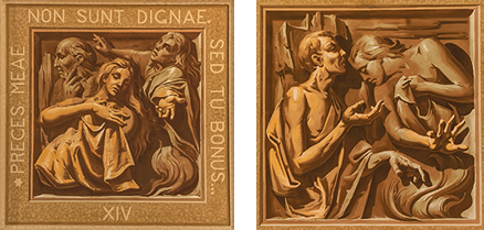 As naves laterais contam com as Sete Obras de Misericórdia Corporais (à esquerda) e as Sete Obras de Misericórdia Espirituais (à direita), pintadas por Emílio Sessa a partir de desenhos de Locatelli.