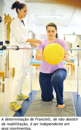 Quatro vezes por semana, há três meses, a aluna de Administração da UCS se desloca do interior de Flores da Cunha, onde vive com os pais que trabalham na agricultura, a Caxias do Sul, para ser atendida na Clínica de Fisioterapia (CLIFI). Francieli chegou em cadeira de rodas, passou a caminhar com um andador e agora já se locomove com apoio de uma muleta. "Quando tive a inflamação na medula, em função de uma bactéria da pneumonia, nem os médicos sabiam me dizer se eu voltaria a andar. O desespero foi grande e ainda tenho receio em caminhar sem apoio. Mas não vou parar a reabilitação até voltar a ser como era antes", enfatiza.