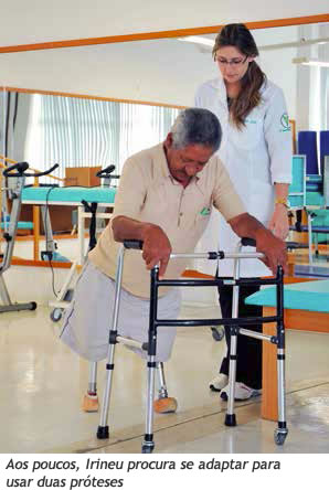 Outro usuário da Clínica é Irineu Alves de Souza (foto abaixo), de 64 anos. Há seis meses ele faz fisioterapia para receber duas próteses. Sua reabilitação é gradual. "Há três anos venho aqui para me adaptar com novos aparelhos. O atendimento é muito bom, as 'meninas' são de ouro. Antes, eu precisava ir a Porto Alegre", diz.