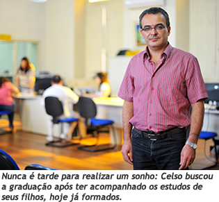 A realização de um sonho pessoal teve que esperar alguns anos. Com um emprego estabelecido na Prefeitura Municipal de Guaporé, Celso Fernando Grando, 51 anos, resolveu destinar os frutos do trabalho à educação dos dois filhos. Ele atua há três décadas no funcionalismo público e, concluiu, em 2007, pelo Núcleo Universitário de Guaporé, o curso sequencial de Gestão Pública. "Essa formação agregou valor às minhas atividades na área financeira da Prefeitura", destaca. O início de 2011 foi um marco na sua vida: ele ingressou no curso de Direito, na unidade universitária de Guaporé. Enfim, era o pontapé inicial para a realização de seu objetivo. "Sempre tive vontade de fazer esse curso, mas o sequencial foi uma necessidade por conta do trabalho. Hoje, depois dos filhos formados, foi possível iniciar esse curso de graduação", conta. As experiências profissionais não faltam na vida de Celso. Além de atuar como tesoureiro, também já foi secretário da Fazenda do município. "São essas oportunidades que me dão a bagagem necessária para aliar os conhecimentos cotidianos ao aprendizado adquirido no curso de Direito", destaca o acadêmico que, após formado, pretende atuar na área tributária ou previdenciária.