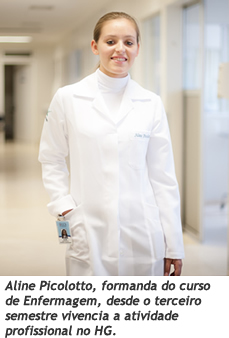 Essa é a rotina de centenas de alunos da UCS, que tem no HG um vasto campo de atuação para aprendizados práticos. Atualmente, cerca de 500 alunos de vários cursos das áreas da Saúde e Humanas, como Medicina "que em 2013 completa 45 anos" , Enfermagem, Psicologia, Fisioterapia, entre outros, utilizam a estrutura do HG para a realização de seus estudos e estágios. A acadêmica do curso de Enfermagem, a formanda Aline Picolotto, 21 anos, conhece bem essa função do hospital, pois desde o terceiro semestre realiza estágios no HG. Ela já atuou em setores como de Internações Clínicas, Centro Obstétrico, Bloco Cirúrgico, Unidade de Urgência e Emergência Médica e UTI Pediátrica. Neste último semestre do curso, está realizando estágio na UTI Adulto.