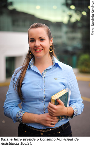 Quando concluiu o curso, em setembro de 2011, Daiana já atuava na Associação Caritativo Literária São José, em Caxias do Sul, como educadora social (ela também trabalhou como educadora social na Associação Centro de Promoção do Menor, no bairro Santa Fé, em Caxias do Sul). Hoje, a assistente social divide seu tempo entre uma escola de Educação Infantil, uma Escola de Ensino Fundamental e um Serviço de Convivência e Fortalecimento de Vínculos, para crianças de seis a 15 anos, mantidas pela Associação Caritativo Literária São José. Além disso, é presidente do Conselho Municipal de Assistência Social, de Caxias do Sul.