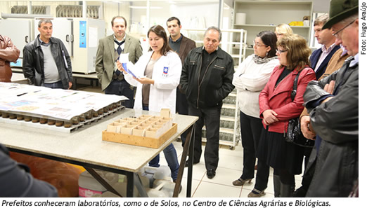 Ao saudar os representantes, o reitor Isidoro Zorzi falou sobre a configuração da UCS como instituição comunitária e regional e explicou como se deu o seu processo de regionalização. "As universidades comunitárias, como a UCS, nasceram do esforço da sociedade e estão muito próximas dos anseios da comunidade. No Rio Grande do Sul, existem 15 universidades comunitárias e elas representam dois terços do total de matrículas no Ensino Superior no nosso estado. Como a única universidade instalada nesta região, queremos que vocês - principalmente aqueles prefeitos que estão no primeiro mandato - conheçam o nosso potencial em ensino, pesquisa e extensão. Potencial que está a serviço da comunidade regional." Os representantes dos municípios visitaram alguns dos laboratórios de ensino e pesquisa, que também podem oferecer serviços à comunidade, tais como: a Clínica de Fisioterapia, o Instituto de Medicina do Esporte e Ciências Aplicadas ao Movimento Humano (IME), o Laboratório de Solos e as futuras instalações da Unidade de Alta Complexidade em Oncologia e Radioterapia - Unacon, no Hospital Geral de Caxias do Sul.