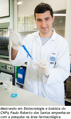 Paulo Roberto dos Santos (foto acima), mestrando em Biotecnologia e bolsista CNPq, é um dos integrantes do projeto. A sua rotina consiste no cumprimento do cronograma do projeto de pesquisa, que é direcionada para a síntese, identificação química e realização de ensaios biológicos de toxicidade dos compostos organometálicos. "Paralelamente, realizo coorientação de dois estudantes de Iniciação Científica, os quais auxiliam nas atividades laborais do projeto, como síntese e recuperação de complexos metálicos, pesquisa bibliográfica e organização do laboratório", relata. Para ele, estar envolvido nesse projeto é muito importante. "A pesquisa dessa classe de medicamentos é instigante, pelo fato da epilepsia e as crises convulsivas serem patologias que afligem uma parcela significativa da população e por existirem opções restritas de tratamento. O desenvolvimento de uma classe de fármacos mais potentes e menos agressivos possibilitaria acréscimo à qualidade de vida ao doente", destaca.