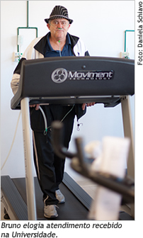 A estrutura avançada e a equipe multiprofissional da Universidade, aliadas à excelência do ambiente universitário, garantem a qualidade do atendimento de pessoas como Dilvo Edson Vieira, 59 anos, de Caxias do Sul. Há três anos, duas vezes por semana, a sua rotina é sair de casa de ambulância, para frequentar o Instituto de Medicina do Esporte e Ciências Aplicadas ao Movimento Humano - IME, no Bloco 70 da UCS, na Cidade Universitária. Ele é um dos integrantes do Programa de Reabilitação para Pacientes com Doença Pulmonar Obstrutiva Crônica, que visa a reintroduzir o pneumopata às suas atividades sociais e cotidianas. Na UCS, Dilvo faz exercícios físicos, sessões de fisioterapia respiratória e psicoterapia. O ex-fumante comemora os sete anos longe do cigarro e os benefícios de frequentar o IME pela segunda vez. "O que faço aqui é tão importante! Antes, não conseguia fazer três minutos de esteira e, agora, faço 30 minutos."