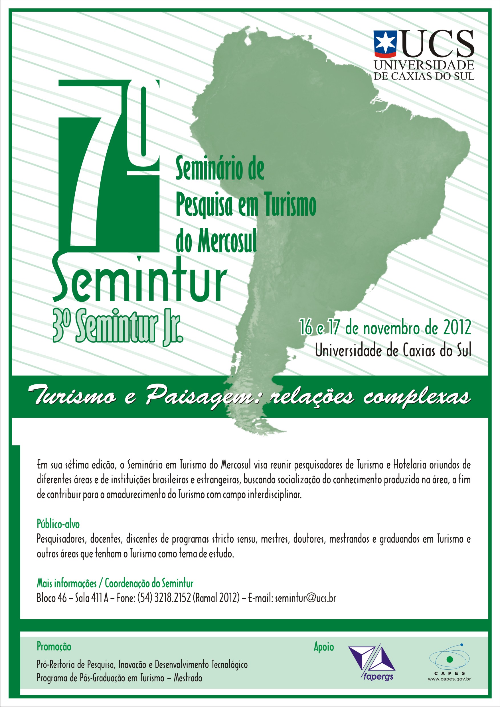 É nessa direção que SeminTUR, em sua sétima edição, apresenta como tema “Turismo e Paisagem: uma relação complexa”, no sentido de ampliar espaços de reflexão que tenham como foco o espectro relacional que o turismo, por sua natureza teórica e pragmática, estabelece com múltiplas áreas do conhecimento, configurando interfaces que se refletem e se concretizam no cotidiano das atividades turísticas, em seus aspectos estruturais, funcionais e institucionais.