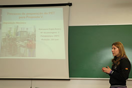 Nas fotos acima, duas estudantes fazem apresentação oral de seus trabalhos de iniciação científica.