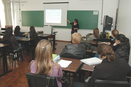 Estudantes e professores assistem à apresentação oral de trabalhos.