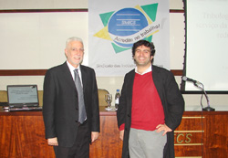 Fotos: os professores Amilton Sinatora e Carlos Alejandro Figueroa, durante a palestra no SIMECS, que reuniu