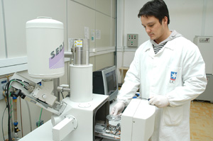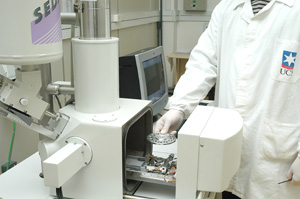Técnico coloca amostras no microscópio do Laboratório de Microscopia Eletrônica.