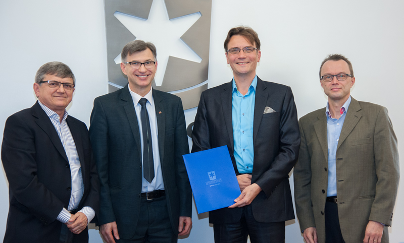 Carlos Köche, dos representantes da TUAS, o reitor Vesa Taatila e