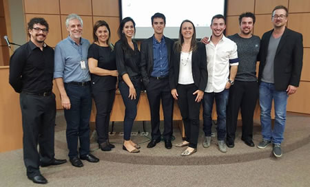 Os coordenadores do StartUCS e os autores dos projetos que se apresentaram no Pitch-Day. |